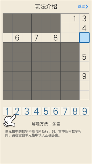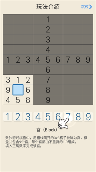 数独游戏棋盘中,用粗线隔开的3x3格子被称为宫,棋盘共包含9个宫,每个宫都由不重复的1-9组成。填入正确数字完成该宫。