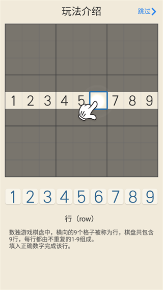 【行(row)】数独游戏棋盘中,横向的9个格子被称为行,棋盘共包含9行,每行都由不重复的1-9组成。填入正确数字完成该行。