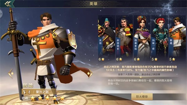 (1)英雄之间相互联系,发挥1+1>2作用。例如:查理曼+李舜臣+刘邦,刘邦李舜臣打出控制,让查理曼打出附加效果(增加20%主动发动率)。