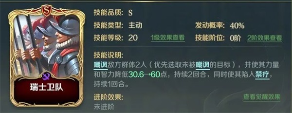 剩下最后一个技能,我们可以选择强化输出兼顾解控的长生军剑舞或者攻防一体附带禁疗的瑞士卫队。