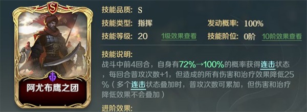 接下来我们再看看队伍中其他英雄应该如何选择吧~由于指挥技能中有伙伴骑兵,先锋突进等可以给友军叠加连击效果的技能,我们可以优先选择自身突击技能释放概率较高的英雄。比如腓特烈,自带技能钢铁王冠技能释放率高达50%,且伤害不俗。