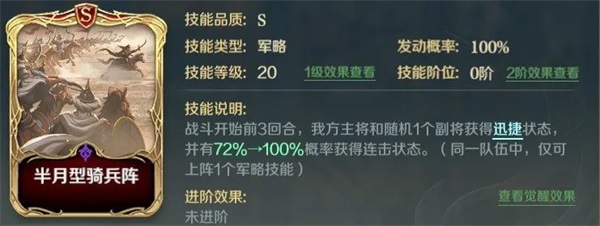 我们可以给善德女王携带突击队的核心技能:半月型骑兵阵,再次为萨拉丁额外添加一层连击,输出最大化。