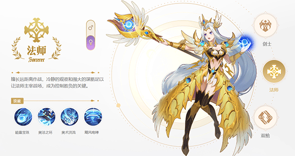 智慧与谋略的化身。最初的智者们与元素沟通,凭借过人的智力与精神属性,驾驭风火雷电。法师可吟唱多种范围杀伤和单体攻击魔法,擅长远距离战斗,是战场中的绝对主宰,决定胜负的关键所在。
