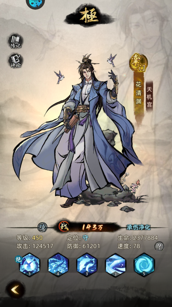 1级:释放技能前清除自身的控制效果(定身、眩晕、冰冻),对目标及其两侧单位造成倍率150%的伤害,释放技能后,清除花清渊和布阵在花清渊后方2个单位的控制效果,同时施加神算,持续2回合。【神算】伤害减免10%,防御提高10%