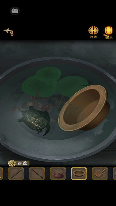 9、回龟龟的水缸,用铜盆舀水,浇在大堂地毯上,是右边石像的线索,打开石像,获得另一片铜叶子;