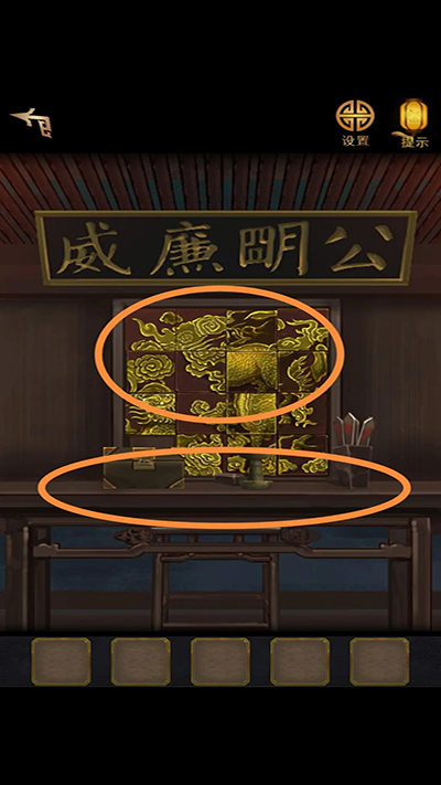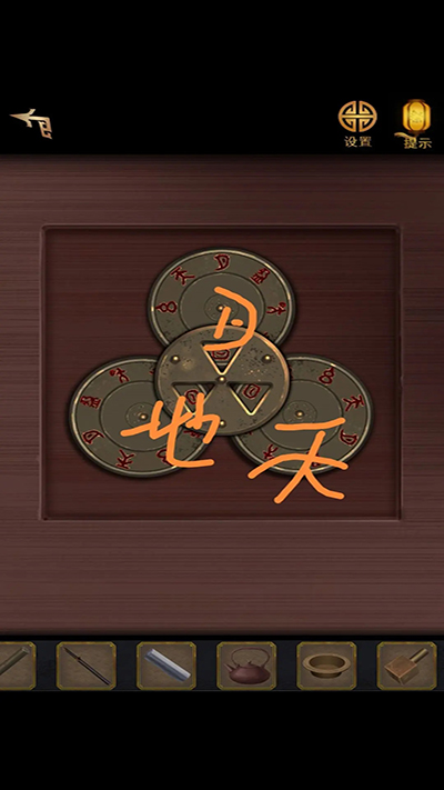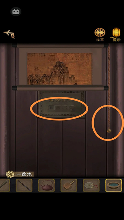 12、墙上挂画旁边绳子一拉,画卷起,露出后面机关,把铜块安上去,按印章顺序拖动图案和字,开门;