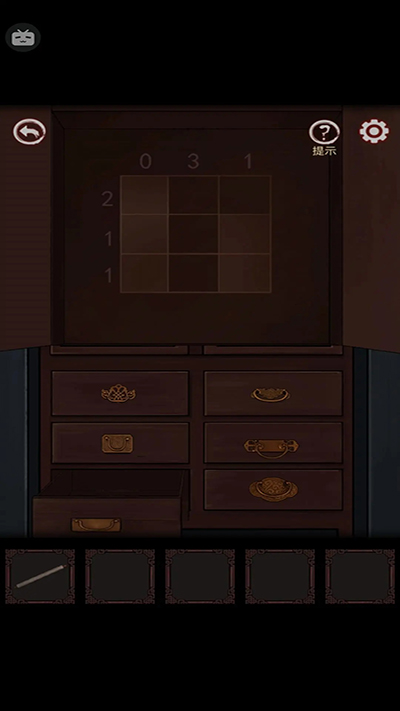 2、一直往里走到墓室婚礼,右边墙上有六个抽屉,点击一个,下一个就会打开,记下顺序,因为第二个固定,所以以此为基准;