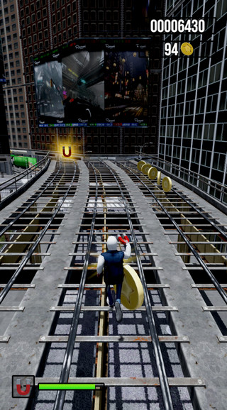 2、用杰克进行跑酷,可以注意轨道上的磁铁道具,捡到就会自动吸附金币