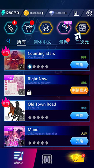 这个游戏最大的特点就是音乐库超级丰富,涵盖流行、EDM、K-POP等多种风格,满足不同玩家的需求。赛道的设计也很有创意,每条都有独特的灯光效果和主题,感觉像在开电音节舞台或者南美海滩一样。游戏的难度设置也很贴心,新手和高手都能找到适合自己的挑战。