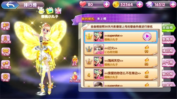 各位唱舞达人们在演唱时,每句歌词都会获得评分,分数会累积越来越高,如果漏唱了就会Miss不但拿不到分数,红心里的血槽也会减少。一个不小心血槽空了,可是会GameOver的哦!如果有小伙伴唱的灰常好,简直是天籁之音,观众们记得要送些礼物捧个场啊~表白神马的也是可以的哦~(猫酱就帮到这里了)