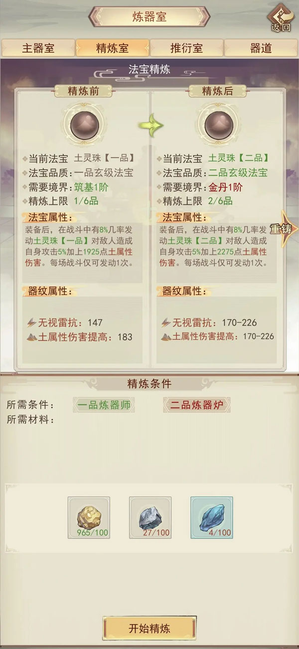 炼器室同理,材料还可以精炼战斗法宝,一般不进行重铸/炼制战斗法宝