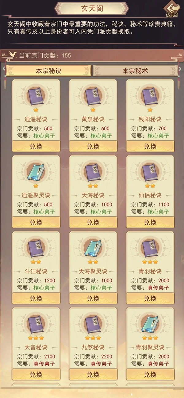 金丹开放门派藏经阁—玄天阁,可在此用贡献兑换秘诀聚灵诀以及秘术,建议先换二星及以上
