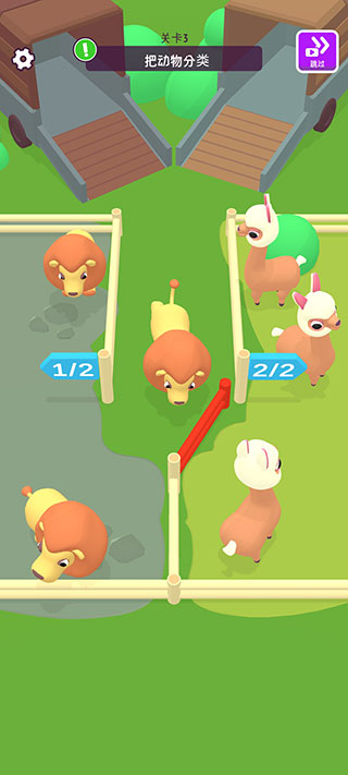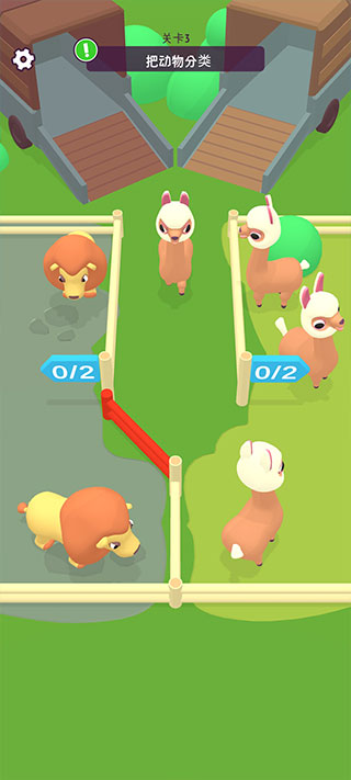 4、关卡3【把动物分类】,红色的移动门可以自由开合,羊驼群在右侧,打开让其顺利回家。
