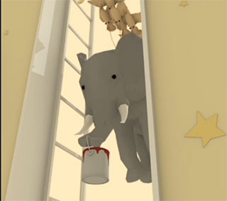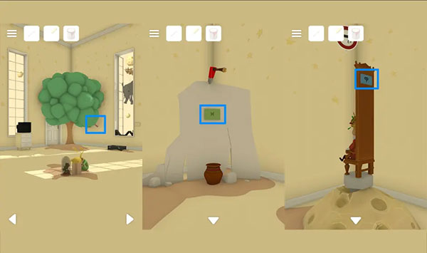 1、首先要找到油漆桶, 转到树的房间,点墙边的机关,密码见画板↑→↓↗,点大象拿油漆