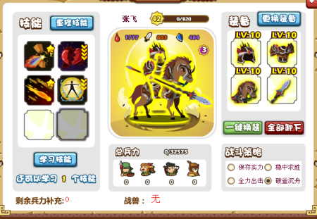 猛张飞在胡莱三国中可谓是大放异彩,在胡莱三国中张飞就是最高单体伤害,因为有专属被动技能,拥有暴击,所以玩家要做的就保持大招效果即可,其它如下表见详情。