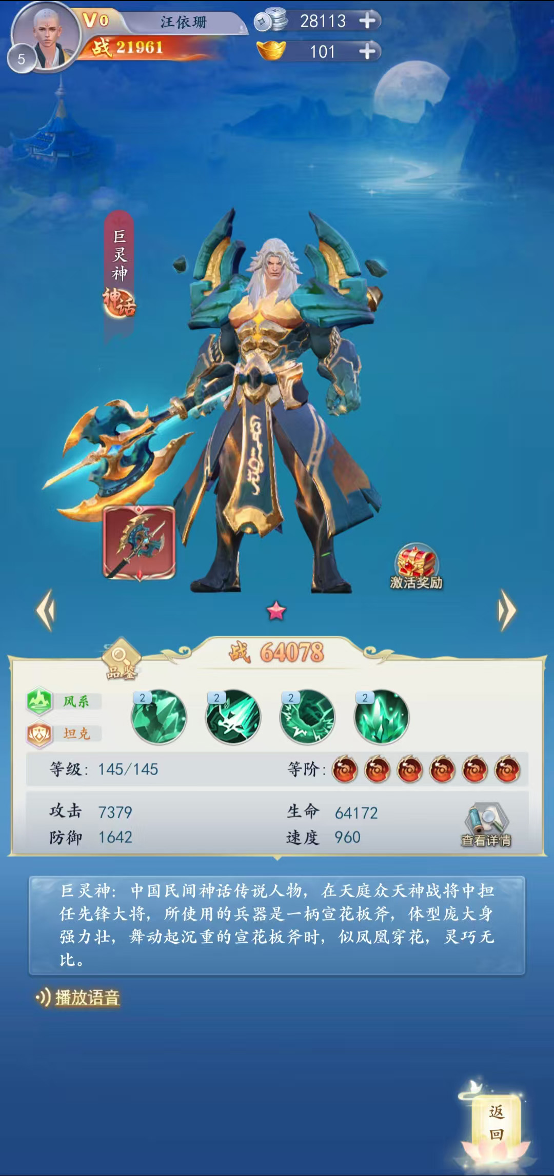 中国民间神话传说人物,在天庭众天神战将中担任先锋大将,所使用的兵器是一柄宣花板斧,体型庞大身强力壮,舞动起沉重的宣花板斧时,似凤凰穿花,灵巧无比。