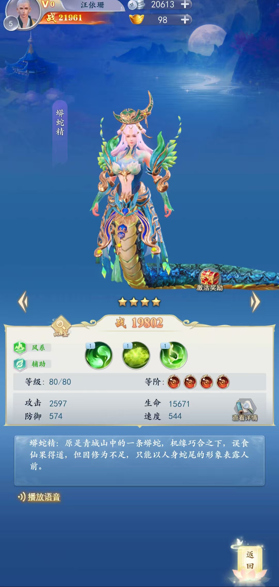 原是青城山中的一条蟒蛇,机缘巧合之下,误食仙果得道,但因修为不足,只能以人身蛇尾的形象表露人前。