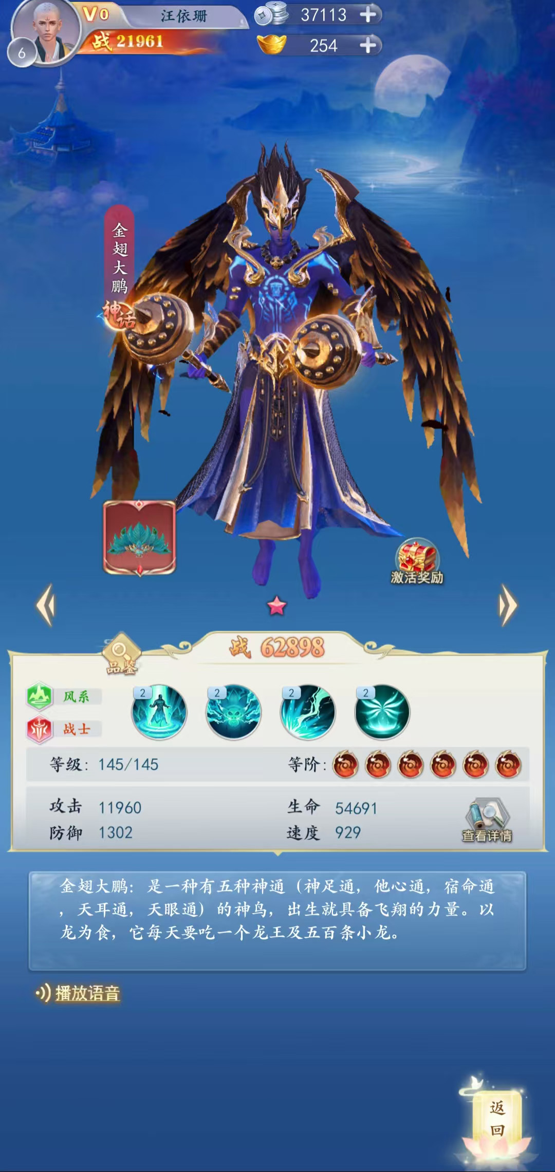 是一种有五种神通(神足通,他心通,宿命通,天耳通,天眼通)的神鸟,出生就具备飞翔的力量。以龙为食,它每天要吃一个龙王及五百条小龙。