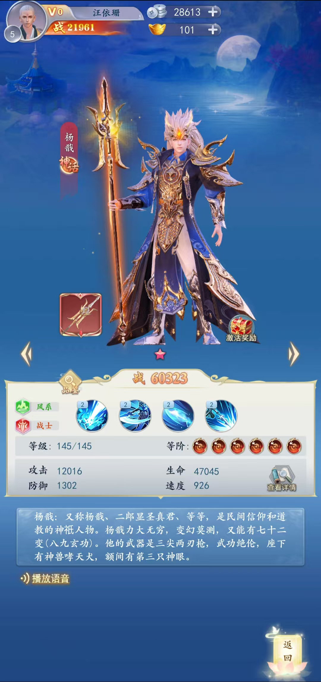 杨戬是民间信仰和道教的神祇人物。杨戬力大无穷,变幻莫测,又能有七十二变(八九玄功)。他的武器是三尖两刃枪,武功绝伦,座下有神兽哮天犬,额间有第三只神眼。