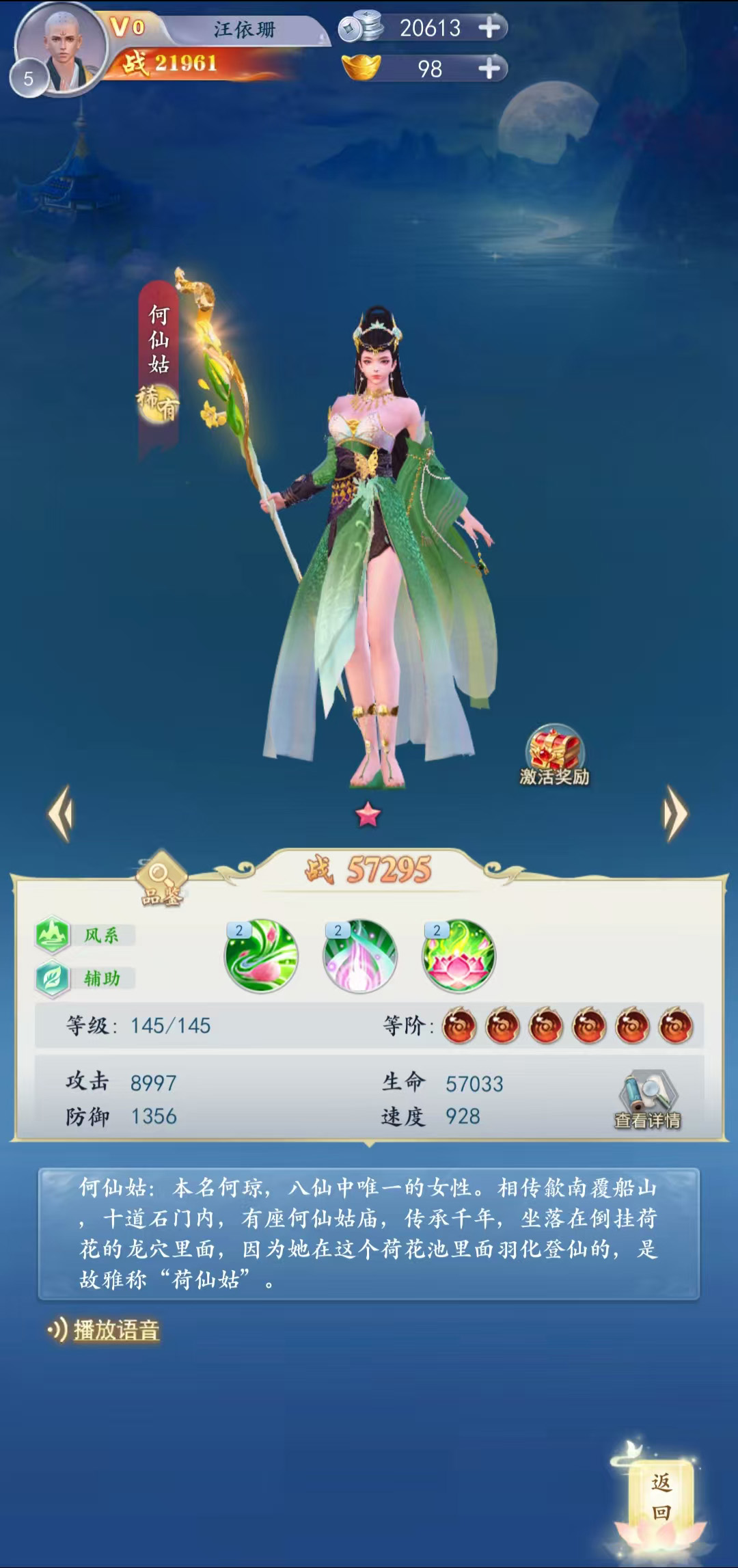 本名何琼,八仙中唯一的女性。相传歙南覆船山,十道石门内,有座何仙姑庙,传承千年,坐落在倒挂荷花的龙穴里面,因为她在这个荷花池里面羽化登仙的,是故雅称“荷仙姑”