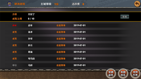 在成员列表中,可以查看本军团基本信息:军团名、军团介绍、军团长、军团成员,军团等级、活跃度等