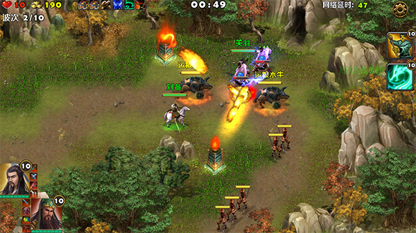 每位三国英雄在塔防战场上都有自己的独特定位和独有技能,您可以控制他们主动出击,施放强力技能,与防御塔配合,消灭大波敌军。