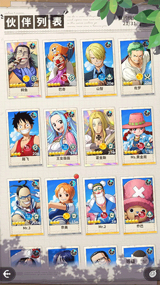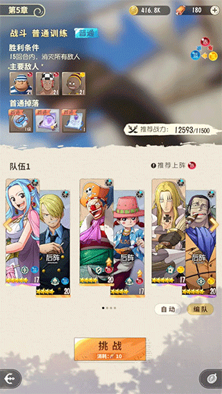前期体力买满用来推主线努力培养开局送的索隆和娜美推图非常好用,前期就用开局的草帽团红色阵营,推荐阵容是:路飞、索隆、娜美、山治。后面第二天登入送乔巴,有了基德换下路飞,有了艾斯换下山治。最后成型阵容:基德、艾斯、娜美、乔巴、替补索隆。