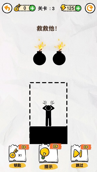 这是一款原创的益智解谜小游戏,里面饱含海量烧脑关卡,每一关,都有一个火柴人等着你开动思维来拯救他!如第一关,根据图中所示的位置画线,阻挡炸弹的掉落。