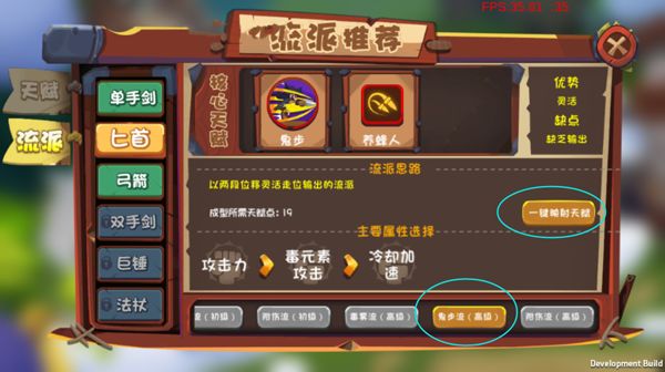 最后,简单介绍一下流派玩法。这就需要大家深入研究每个技能的属性功能啦,无论选择升级暴击技能、攻速技能还是冷却技能,都有最完美的一套搭配,能用最少的天赋点实现最大的攻击效果!当然,流派还有系统搭配好的几套,进入流派界面,选择对应的武器,在最下方选择你想要的流派,比如匕首武器的鬼步流,然后点击一键映射到天赋,简单的天赋流派搭配就完成啦!