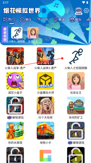 1、进入烟花模拟世界app,上方可以根据分类挑选游戏