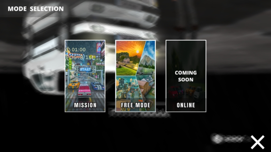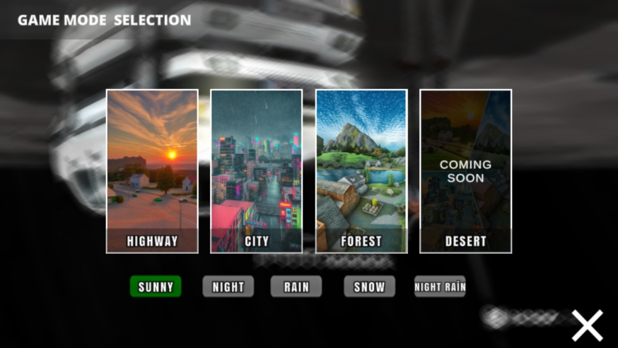 9、第二个则是自由模式,这个模式则分为很多的场景,比如说公路、城市、森林等,而不同的场景又有不同的天气,比如晴天、夜晚、雨天、雪天、夜雨;玩家可以依据自身喜好进行选择;