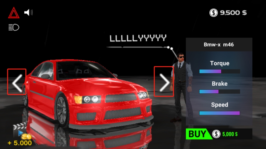 3、接下来就进入主页了,点击两边的箭头图标可以更换车辆,不过需要足够的金币来购买;