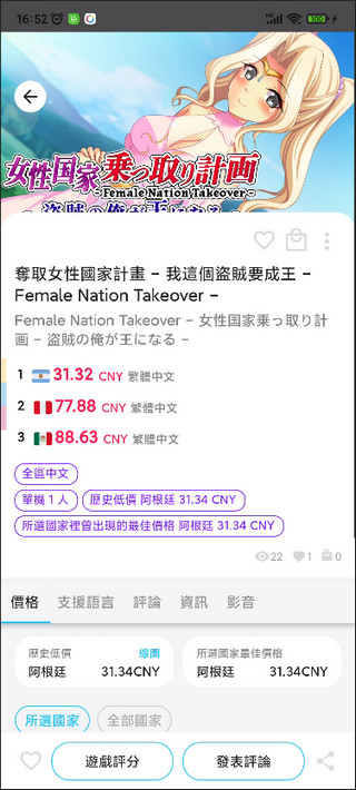 5、点击某款游戏,可以看到相关的所有商品,所有地区价格和支持的语言,以及评论资讯等等
