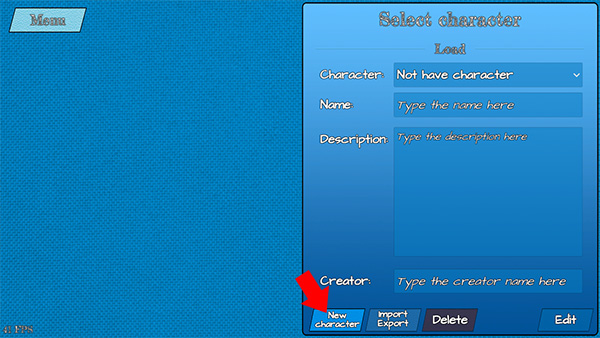 2、来到下图界面后点击下方的New character来创建我们的新角色(也可以使用Import/Export来导入/导出角色)