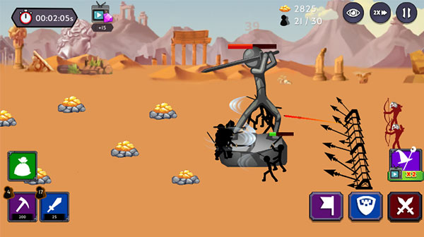 火柴人战争2帝国一款以经典火柴人为主题打造的策略对抗类游戏,与火柴人不同的是,这个版本添加了不同的升级方式和 200 多种物品,还有惊人的升级系统和更多助推器。同时,游戏继承了原来的经典玩法,首先你需要建造矿工来收集珍贵的黄金和宝石,你可以用它们来购买各种火柴人战士,包括矿工、剑士、弓箭手、重装步兵、巫师、小兵、弹射器、塔等,每个战士都进行了炫酷的设计,让玩家可以有更好的视觉体验。除此之外,火柴人战争2帝国的还有独特的物理引擎,使得火柴人的动作和反应更加真实和有趣。你可以体验到独特的击打、跳跃和翻滚的动作,为战斗增添了一份趣味和可塑性。对此感兴趣的朋友快来建立您的罗马帝国,利用您的才能征服所有国家!