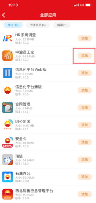 步骤3:在“移动平台”中,“应用”类下,找到【中油员工宝】,点击【添加】,下载并安装。