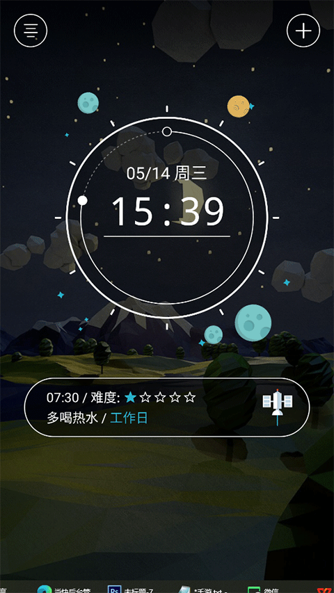 1、打开火箭闹钟App,主面板是一个细节丰富,界面美观的大屏时钟;