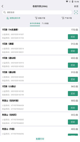 烟草价签管理app是一款专业的烟草价格打印软件,提供了专业的商品管理以及价签打印解决方案,为商家提供方便、快捷、省时省力的服务。或许有些商家对烟草价格掌握的不全,所以它提供了卷烟列表功能,该列表囊括了2986种卷烟的价格,条码、盒数、规格、产地、焦油量、全市统一零售价全部都能查看。另外通过卷烟搜索功能输入卷烟名称也能快速得到该类型的价格。