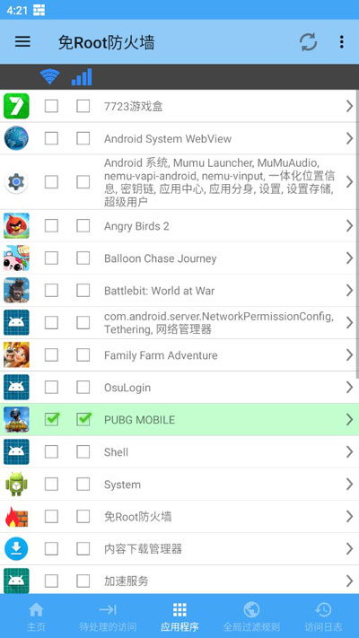 2、然后找到pubg应用,将前面的网络连接勾选上。