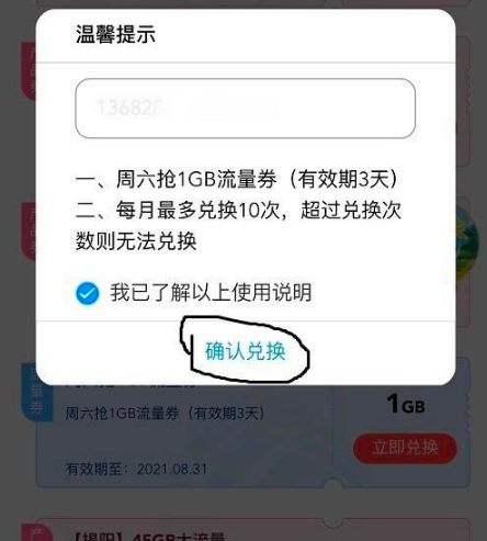 6、需要兑换的时候就跟着下图操作就可以了。如果要查流量的话,可以在APP里面查,也可以拨打电话1008611,通话结束会收到一条流量信息