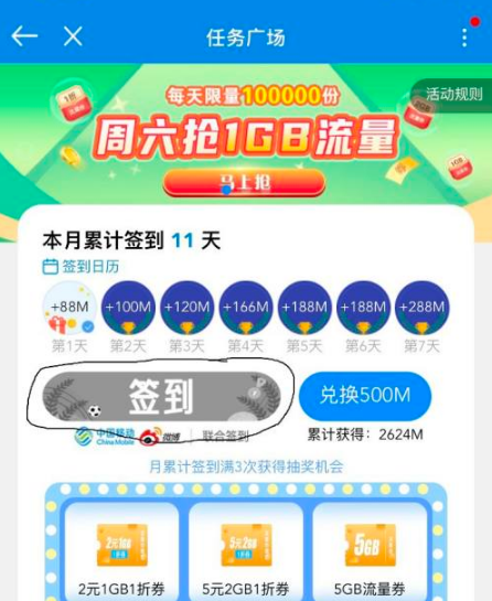 2、点击“签到”,每天都可以签到的,流量累积到500,就可以兑换一次,有效期3天。(所以大家不要忘记每天签到,这样积攒的流量比较多)