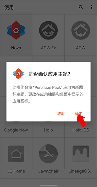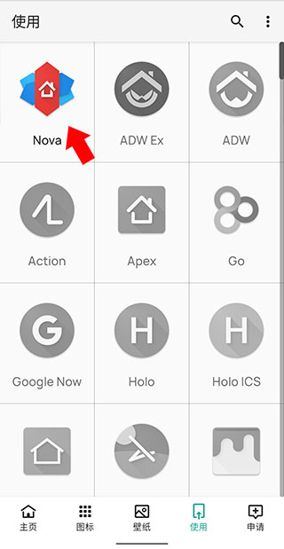 3、选择我们需要想要为其启用的桌面启动器,如果此时已经安装了相应桌面,那么图标会变亮,我们这里以Nova Launcher为例