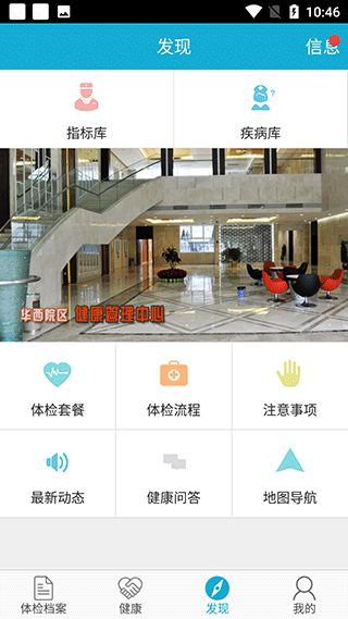 3、点击发现,可以查看相关医院的体检套餐、流程和注意事项。