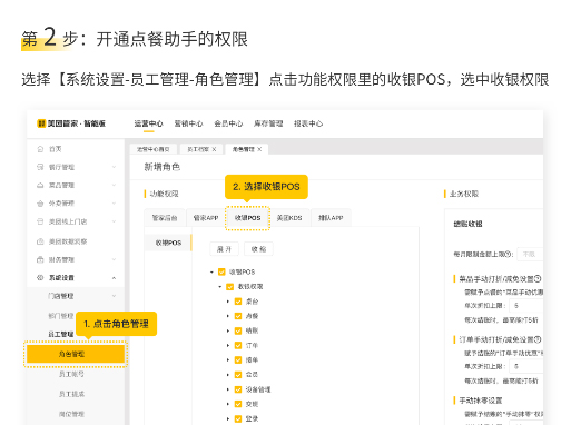 选择【系统设置-员工管理-角色管理】点击功能权限里的收银POS,选中收银权限