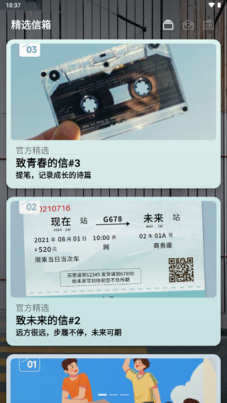 App 首页的公开信箱中,已经分成了精选信箱、未来信箱、有声信箱三部分,在这其中掺和着酸甜苦辣咸的公开情怀信件。晚上失眠的时候,看看他人的情怀,说不定还会是一针强心剂。