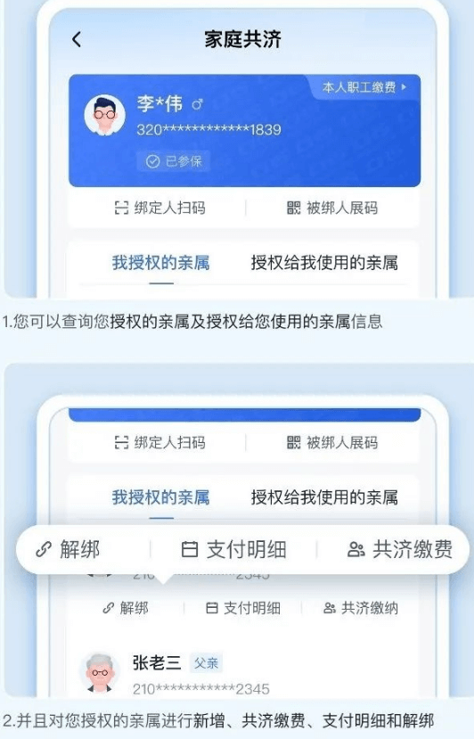 家庭共济是指职工医保参保人将其个人账户内的资金共济给家庭成员使用时,需要办理的相关事项。职工参保人可以进行家庭共济的绑定、查询、解绑、共济支付明细查询、代缴费等操作。使用对象为本省职工医保参保人员的配偶、父母、子女、兄弟姐妹、祖父母、外祖父母、孙子女、外孙子女等家庭成员,家庭成员应为本省基本医疗保险(包括职工医保和城乡居民医保)的参保人员。