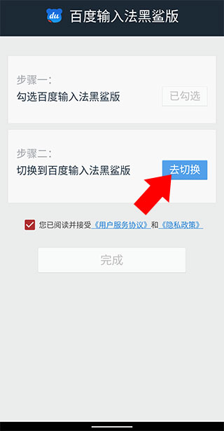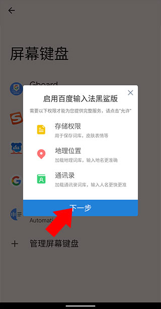 3、之后我们在同界面打开百度输入法黑鲨版,此时提示需切换默认输入法,我们按照其要求切换为百度输入法黑鲨版,首次启动需要我们给予权限