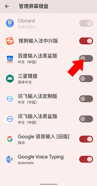 2、然后在其中找到百度输入法黑鲨版并启用