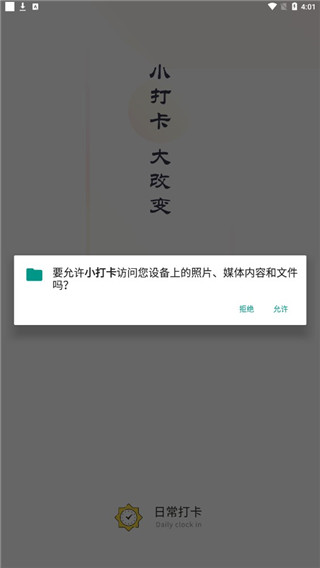 3、点击允许小打卡访问您设备上的照片、媒体内容和文件。