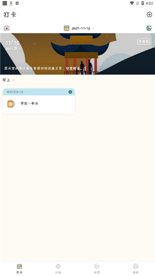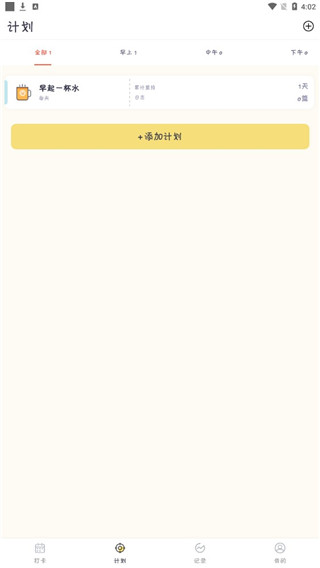 4、进入软件后,你可以选择添加自己的打卡计划,在这里小编设置了早起一杯水。